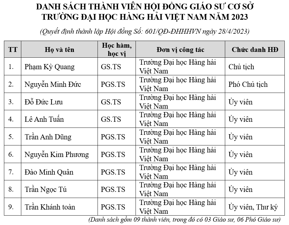 Quyết định số 601/QĐ-ĐHHHVN về việc thành lập Hội đồng Giáo sư cơ sở Trường Đại học Hàng hải Việt Nam năm 2023 gồm các thành viên sau: