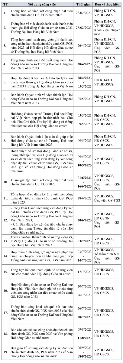 Hội đồng Giáo sư Cơ sở Trường Đại học Hàng hải Việt Nam thống nhất kế hoạch hoạt động xét công nhận đạt chuẩn chức danh GS, PGS năm 2023 như sau:
