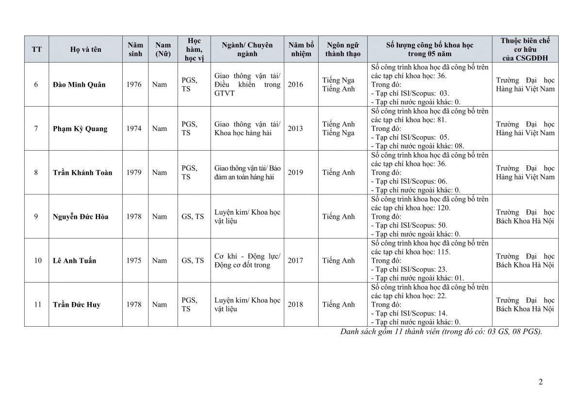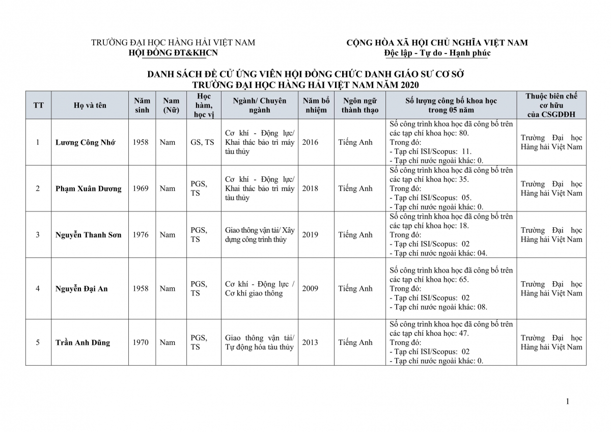 Hội đồng Đào tạo & KHCN căn cứ tiêu các tiêu chuẩn nêu trên để lập danh sách đề cử ứng viên tham gia Hội đồng Giáo sư Cơ sở Trường Đại học Hàng hải Việt Nam năm 2020 như sau: