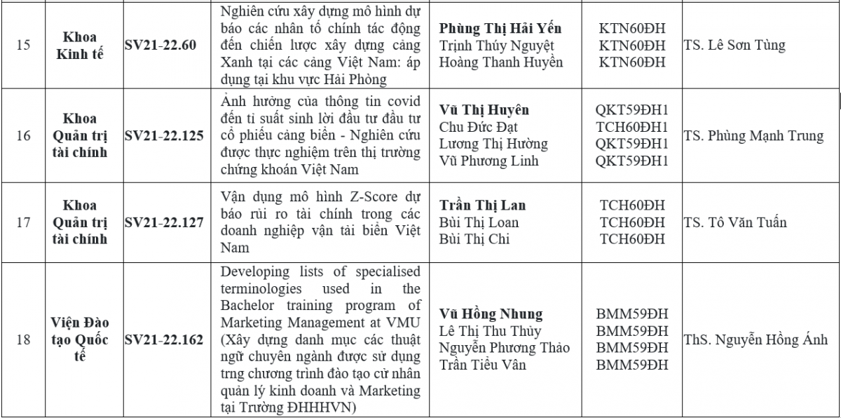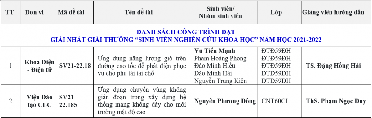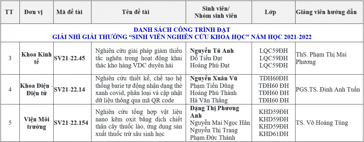 Trên cơ sở đó, Hội đồng xét tặng Giải thưởng đã cân nhắc, xem xét, thảo luận và cho điểm đánh giá dựa trên các tiêu chí trong Quy chế xét tặng giải thưởng Nghiên cứu khoa học sinh viên, đồng thời lựa chọn những công trình tiêu biểu có chất lượng, tính ứng dụng thực tiễn cao tham gia các công trình xét tặng Giải thưởng KH&CN dành cho sinh viên trong các cơ sở giáo dục đại học năm 2022 của Bộ Giáo dục & Đào tạo. Hội đồng đã thống nhất và được Hiệu trưởng phê duyệt các kết quả giải thưởng như sau: