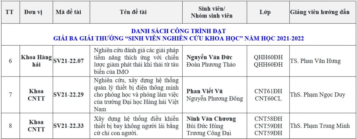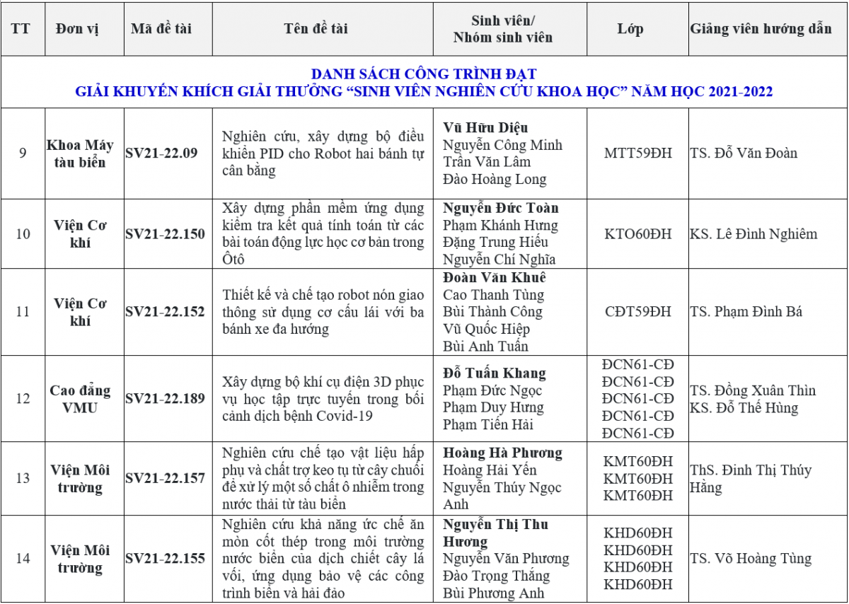 Tiếp tục phát huy truyền thống nghiên cứu khoa học, năm học 2020-2021, Trường Đại học Hàng hải Việt Nam có tổng số 189 đề tài NCKH sinh viên cùng sự tham gia của hơn 600 sinh viên với các nội dung nghiên cứu rất đa dạng, tiếp cận từ lĩnh vực như mô phỏng, tự động hóa, công nghệ thông tin, cơ khí chế tạo, môi trường, logistics, kinh tế, luật, ngôn ngữ Anh,… Sau khi tiến hành nghiệm thu tại cấp cơ sở, các Khoa/Viện chuyên môn đã tuyển chọn 27 đề tài nghiên cứu khoa học xuất sắc nhất từ các đơn vị gửi xét tặng Giải thưởng NCKH Sinh viên cấp Trường. Trong 02 ngày 20 và 21/05/2022, Trường Đại học Hàng hải Việt Nam đã tiến hành tổ chức Hội nghị tổng kết và xét tặng Giải thưởng “Nghiên cứu khoa học sinh viên” cấp Trường năm học 2021-2022 dưới sự chủ trì của PGS.TS Nguyễn Thanh Sơn - Phó Hiệu trưởng Nhà trường.