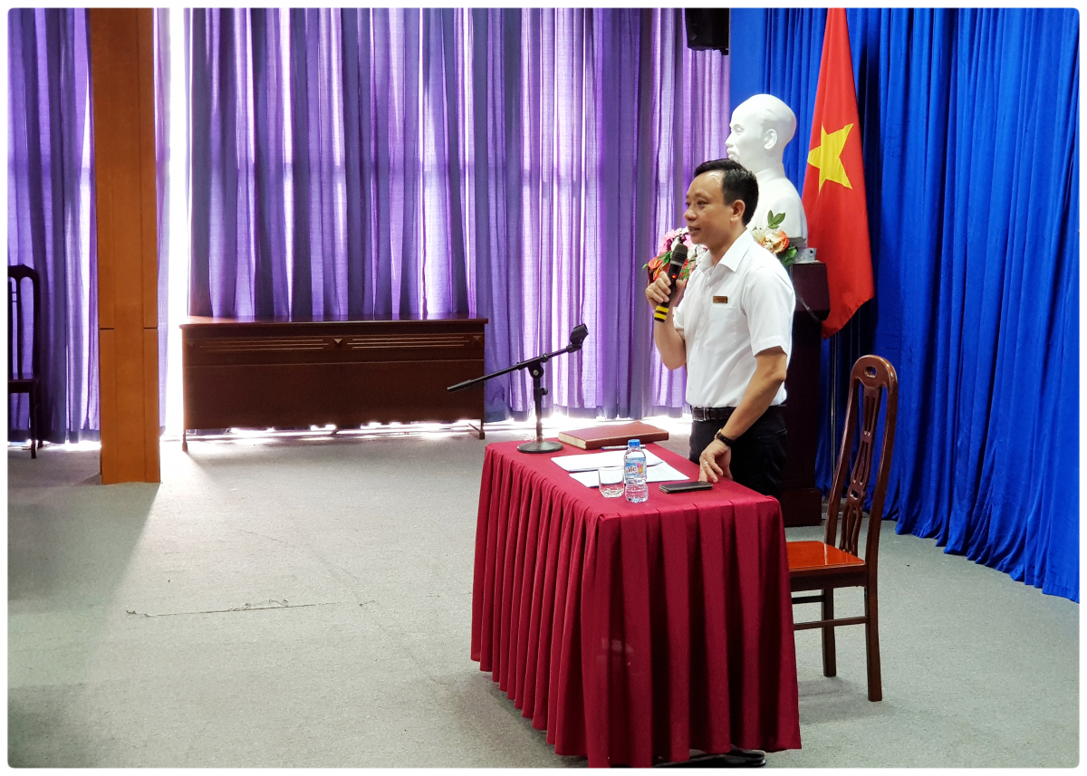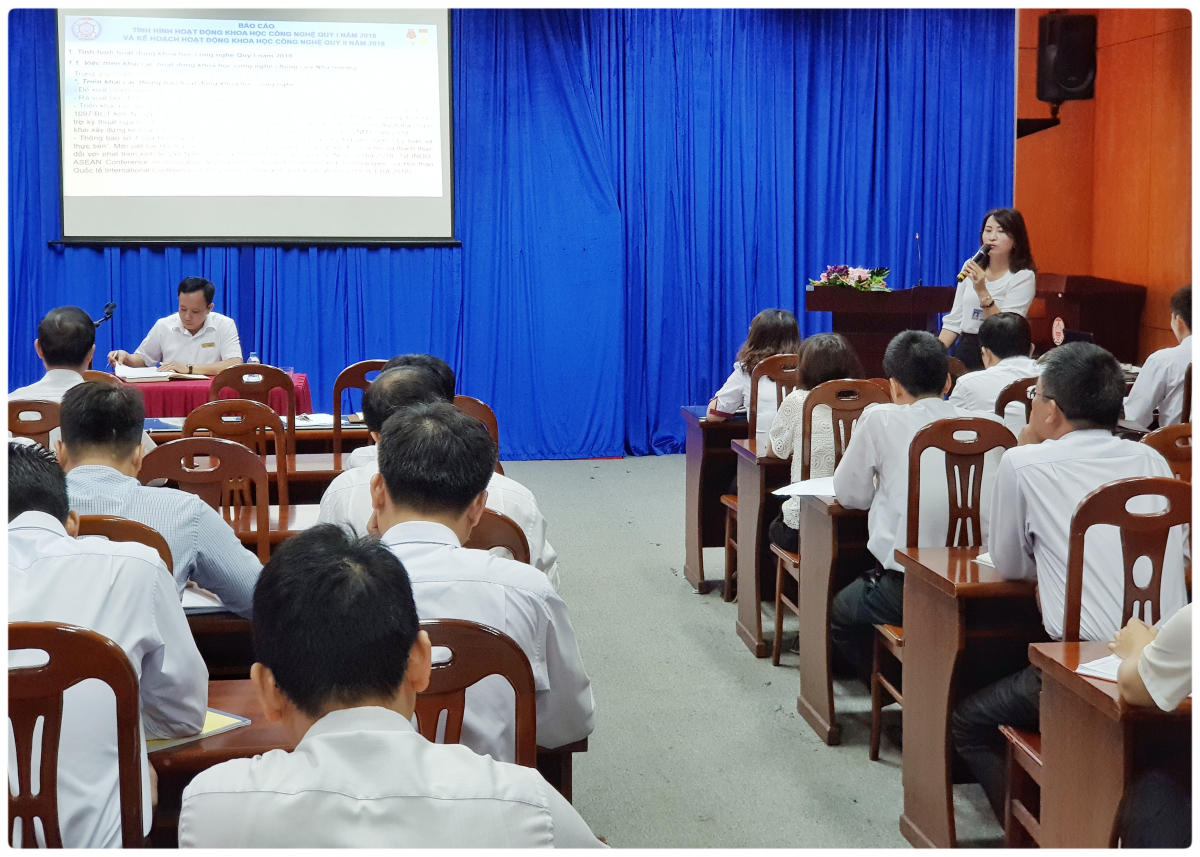 PGS.TS. Nguyễn Hồng Vân - Trưởng Phòng KH-CN trình bày báo cáo tổng kết hoạt động KHCN Quý I/2018 và phương hướng hoạt động Quý II/2018