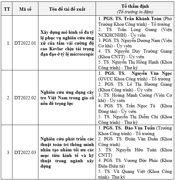 1. Phê duyệt thành viên Tổ thẩm định đề xuất đăng ký đề tài Nghiên cứu khoa học cấp Trường trọng điểm năm 2022